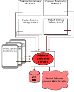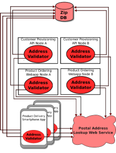 Consider a system that uses an Address Validator service.  In this diagram, the Address Validator business logic is compiled into every application that needs it.